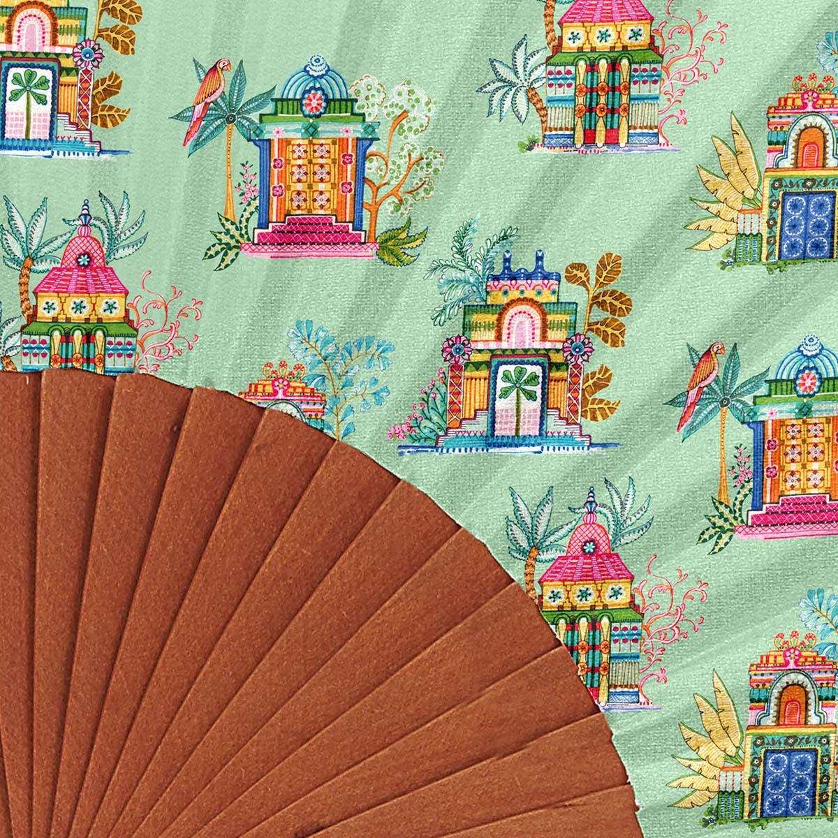 La toile de notre éventail après impression, y est apprêtée puis plissée. Elle est par la suite montée à la main par nos fées couturières sur une monture en bois massif de merisier poli.